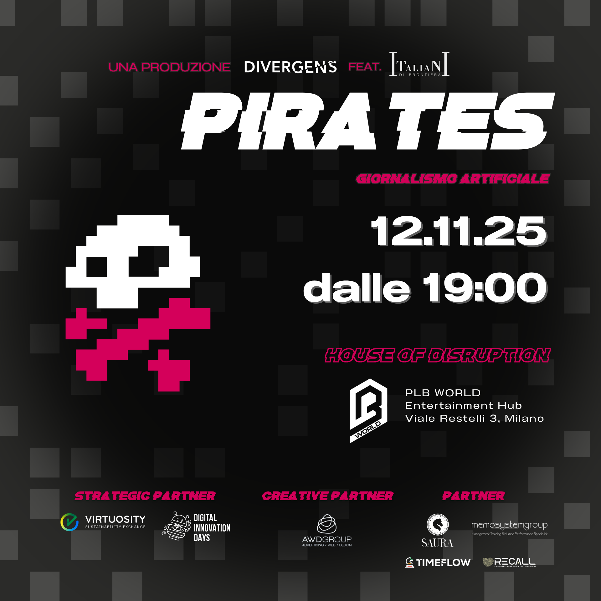 Ribelli, divergenti, fuori rotta: chi lancia un'impresa o un modo diverso di fare impresa sfida il sistema da dentro, con una visione e una mappa del tesoro tutta sua. Pirates è l’evento live firmato Divergens dove innovatori e startupper si raccontano senza filtri: storie, errori, paure e intuizioni dal cuore del cambiamento. Un’occasione per incontrare chi il futuro lo sta costruendo, tra tech, digitale e nuove imprese.